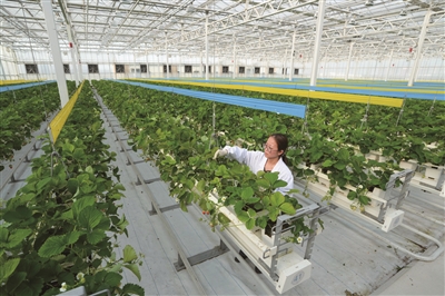 在江苏昆山陆家未来智慧田园“A+温室工场”,工作人员在进行草莓基本特性检测。 ■新华社发