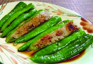 祖母采摘辣椒可谓百里挑一,她眯着老花眼,仔细比了又比,一棵辣椒树只挑得中一两只没长虫眼、肉厚汁多、外形匀称饱满的青椒或红辣椒。挑得那么几十只,洗净,让太阳稍微照一照,再用石碾或石磨将炒熟的糯米碾(磨)成细细的粉末,加入八角粉、盐、味精和少许水,搅拌成稍湿较硬的糯米粉团。祖母边忙活边念叨,说青椒一定要沥干水,不能沾一丁点生水,才可在坛子里久放不坏味。说话的当儿,祖母已将青椒去掉蒂根,用剪刀尖尖沿侧线在中间划开一条缝,长度约模辣椒的四分之三,再一点点填入糯米粉,挨个放进坛子里密封。