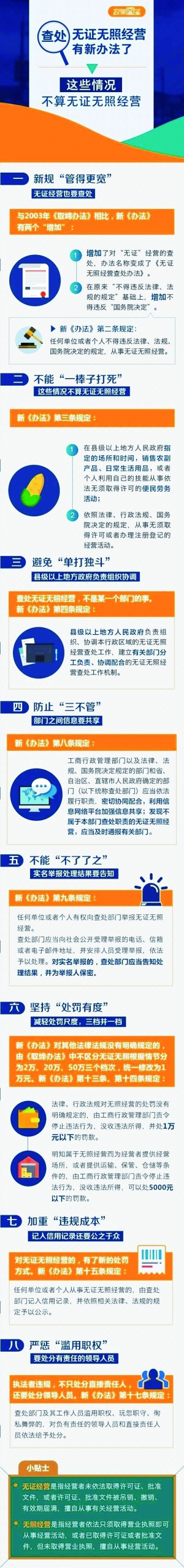 现公布《无证无照经营查处办法》,自2017年10月1日起施行。