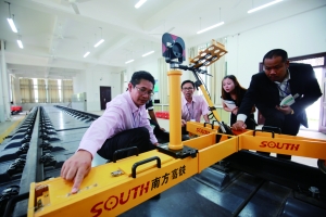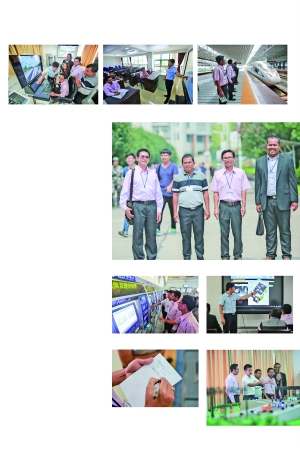 2017年9月28日 星期四 特别报道 泰国教师高铁学院“拜师学艺” ■文/本报记者 向吟吟 通讯员 彭杨华 图/本报记者 刘晓飞 “第一次模拟开地铁,真的很新奇。”9月19日,是索拉朋·桑格拉在湖南高速铁路职业技术学院(以下简称湖南高铁学院)学习的第19天,当天在机电系王小刚讲师的指导下,他在地铁仿真驾驶实训室里当了一次“地铁司机”。 索拉朋·桑格拉是泰国哇碧巴通职业技术学院副院长。9月初,他和学院的桑亚·查萨德、阿沃德·比阿德劳格、瓦塔拉·拉高坦3位教师来到湖南高铁学院,开展为期一个月的交流和学习。期间,他们在此接受铁路专业管理和技能知识培训,系统学习铁路客运组织、铁道车辆、电气化铁道技术等专业,并走进长沙高铁南站、衡阳高铁东站等地进行实地参观体验。 作为全国第一所以“高铁”命名、开办专业全面对接高铁产业链中的工程建设、运营、维护和多元化服务等环节的高职院校,湖南高铁学院积极服务“一带一路”倡议和
