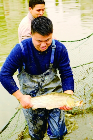 洪善财介绍,他养的鱼不多,草鱼和鳙鱼加起来就40多条,他每天的主要工作就是给塘里的鱼喂草,鱼少塘大,这种环境里长出的鱼,肉质更好。由于塘从未干过,这次捞上来的草鱼,最大的有五六公斤。