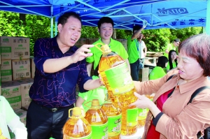 “齐家油业”与“尘薇公益”在莲湖广场共同举办爱心公益活动,夏先晖(左)与消费者热切互动。