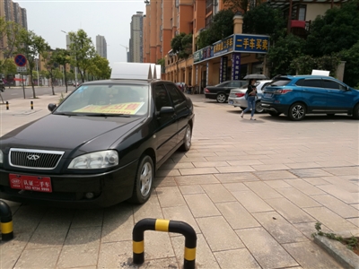 12日下午,在西二环三江路口地段附近,记者看见数台小车零乱地停靠在一家二手车销售门店前,其中一台黑色小车停靠在斑马线旁,过往行人只得无奈绕道而行,小车车顶上竖立的标识牌内藏着石块。“持续高温酷热,摆设在人行道上展示的样品车相对较少。”家住棕榈园的居民刘女士告诉记者,若天气凉快,摆在人行道上的车辆更多,而且不时还有青年男子站在店外揽客,人车混杂,存在一定的安全隐患。