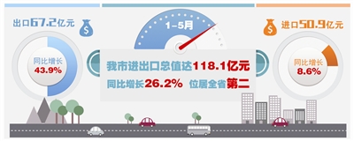 其中,出口67.2亿元,占全省出口总值的6.8%,同比增长43.9%;进口50.9亿元,占全省进口总值的11.9%,同比增长8.6%。数据显示,今年2—5月,全市进出口值同比分别增长47.7%、54%、27.4%和12.9%,连续四个月保持同比增长。其中,5月份进出口22.9亿元,同比增长12.9%,只是增速有所回落。进、出口方面,5月份出口13.7亿元,同比增长16.5%;进口9.2亿元,同比增长7.9%。