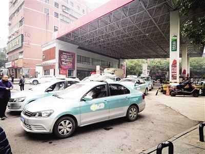 昨日上午10许,记者在东风路东三角线中石化加油站看到,加油站靠东风路一侧出口处,有八台出租车扎堆停靠,有司机口喊“云集、云集”四处揽客。记者现场看到,这些出租车揽客的地方紧靠东三角线公交站,附近并无出租车停靠载客的标志。出租车占用加油站出口道路揽客,存在安全隐患。 ■记者 周卫国 摄