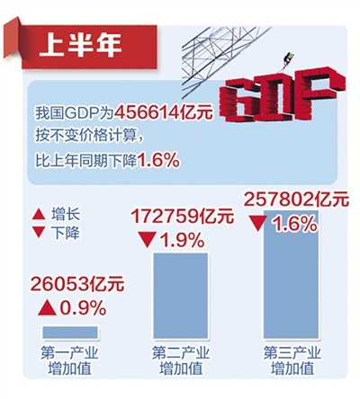 上半年,我国GDP为456614亿元,按不变价格计算,比上年同期下降1.6%。其中,第一产业增加值26053亿元,增长0.9%;第二产业增加值172759亿元,下降1.9%;第三产业增加值257802亿元,下降1.6%。