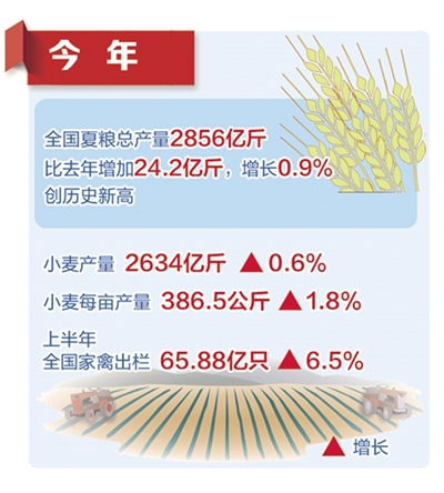 据对夏粮主产区实割实测抽样调查和对非主产区的重点调查推算,今年全国夏粮总产量2856亿斤,比去年增加24.2亿斤,增长0.9%,创历史新高。其中,小麦产量2634亿斤,增长0.6%。