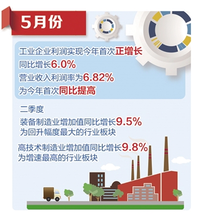5月份,在成本压力缓解、价格变动等有利因素作用下,工业企业利润实现今年首次正增长,同比增长6.0%;营业收入利润率为6.82%,为今年首次同比提高。其中,石油加工、电力行业利润分别增长8.9%、10.9%,化工、钢铁行业利润明显改善,降幅较上月大幅收窄。前5个月,工业企业效益状况呈逐月好转趋势,累计利润降幅逐月收窄。