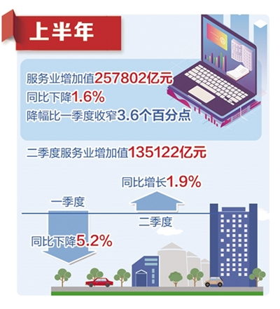 服务业稳步复苏。初步核算,上半年服务业增加值257802亿元,同比下降1.6%,降幅比一季度收窄3.6个百分点。服务业增加值占国内生产总值比重为56.5%,比上年同期提高0.4个百分点,比第二产业高18.7个百分点。二季度服务业增加值135122亿元,由一季度同比下降5.2%转为同比增长1.9%。