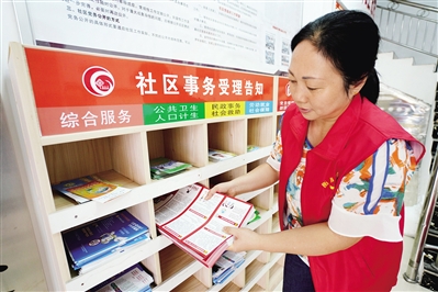 | 8月26日,石鼓区人民街道人民社区,“衡阳群众”志愿者正在整理社区的事务告知柜。为了方便向群众宣传相关政策,社区设置了这种事务告知柜,将人口计生、公共卫生、民政事务、社会保障等相关宣传资料归类纳入其中,此举一经推出,便受到群众普遍欢迎。