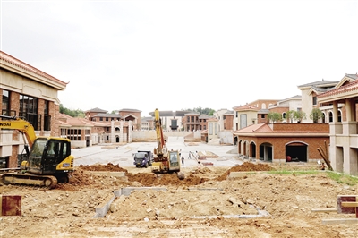 9月2日,在天子山传奇镇项目一期建设现场,记者看到展示中心主体建筑及室外景观、文化艺术街一期主体结构、祝融剧场主体结构和室外装修、交通接驳站等已经全部完成,正在进行园区户外景观的施工。