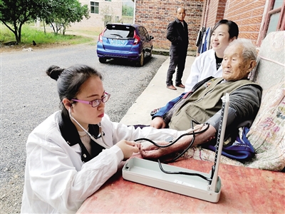 | 10月20日,祁东县卫生健康局、县老年人服务中心组织医务工作者来到白地市镇茶林村,为105岁抗美援朝老兵刘敦知进行定期体检,并送去重阳节慰问和祝福。图为医务工作者为其测量血压。