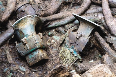 这是在三星堆遗址考古发掘现场3号“祭祀坑”内拍摄的青铜器和象牙(3月16日摄)。