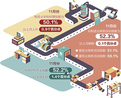 数据显示,11月份,制造业采购经理指数为50.1%,比上月上升0.9个百分点;非制造业商务活动指数为52.3%,比上月略降0.1个百分点;综合PMI产出指数为52.2%,比上月上升1.4个百分点。