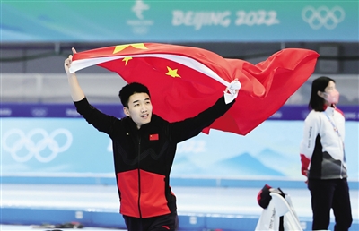 当看到大屏幕成绩排名的那一刻,高亭宇和教练、团队成员等紧紧抱在一起,欢呼雀跃。随后,他身披国旗,比着“一”的手势,在“冰丝带”绕场一周,和现场观众共享胜利的喜悦。