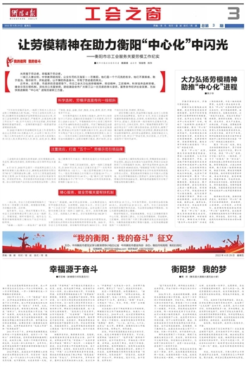 近年来,在市委、市政府的坚强领导下,市总工会大力弘扬劳模精神、劳动精神、工匠精神,科学培养选树劳模,健全示范引领机制,深化关心关爱举措,团结激励全市广大职工以一往无前的奋斗姿态,服务全市经济社会发展,为加快推进衡阳“中心化”进程贡献职工力量。