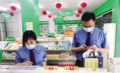 6月16日,衡南县检察院公益诉讼办案干警来到“消”字号抗(抑)菌制剂生产企业和药店、母婴用品店等销售场所,进行“消”字号抗(抑)菌制剂专项监督调查。图为检察干警查看、通过智能手机查询比对是否有非法添加嫌疑产品的信息。■通讯员 丰文勇 摄