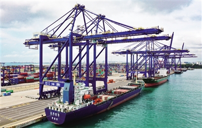 巨轮靠泊,岸桥伸缩,洋浦国际集装箱码头一派繁忙。