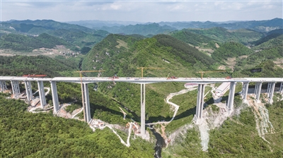 4月28日,贵平高速南明河特大桥主桥顺利实现合龙(无人机照片)。 当日,由贵州公路集团承建的贵(阳)平(塘)高速公路南明河特大桥主桥顺利实现合龙。南明河特大桥是贵平高速的控制性工程之一,为多跨连续刚构桥,全长1129.8米。 ■新华社发