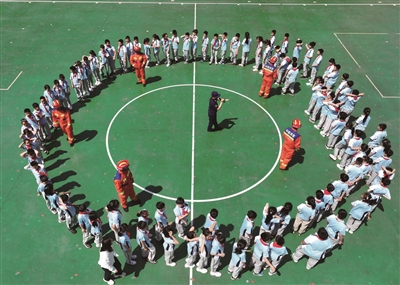 5月12日,武汉市未来实验小学美林校区小学生进行躲避地震逃生演练。5月12日是第17个全国防灾减灾日,各地展开学习应对灾难知识活动。 ■新华社发