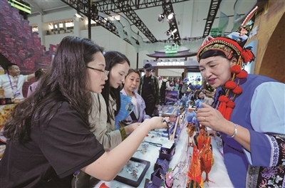 | 6月20日,观众在第9届中国—南亚博览会旅居云南馆了解白族布扎手工艺品。第9届中国—南亚博览会于6月19日至24日在云南昆明举行。本届南博会首次设立的旅居云南馆设旅居云南、住在云南、康养胜地三大主题展区,通过旅居资源展示、非遗展演、旅居业态和产品推介、旅居企业签约洽谈等形式,全方位呈现云南“始于山水、归于烟火”的美好。