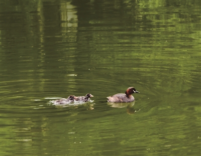 6月23日下午,记者行至岳屏公园九曲桥,只见一只䴙䴘“妈妈”正带着三只刚出生不久的宝宝在碧波间悠游。小家伙毛茸茸的小圆脑袋像绒球般可爱,紧紧跟在妈妈身后,好奇地东张西望,萌态十足。只见“妈妈”轻车熟路,领着“巡游队”,灵巧地穿梭于九曲桥附近的睡莲丛中,湖面荡开一圈圈涟漪。