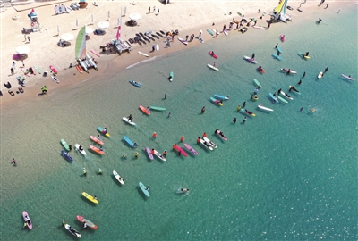 8月10日,游客在三亚市后海村附近海域冲浪嬉水(无人机照片)。 暑期,许多游客来到海南三亚,学习体验冲浪,感受与海共舞的乐趣。