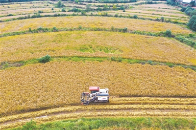 图片新闻 10月14日,在河南省信阳市光山县罗陈乡张楼村,农民在抢收水稻(无人机照片)。 当前正值“三秋”生产关键期,为应对阴雨天气造成的影响,各地加强农机和烘干设备调度力度,积极开展湿粮抢烘和晾晒作业,助力秋粮收获。 ■新华社发