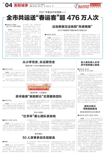本报讯 3月5日,在我市“‘3·5’学雷锋文明实践主题志愿服务活动”启动仪式现场,衡阳市中心医院神经内科主办的“红手环”卒中义诊及宣传志愿服务项目,获得“2020年度最佳‘衡阳群众’志愿服务项目”奖。