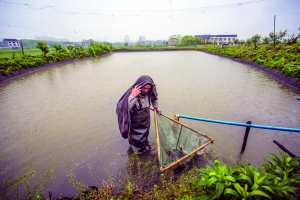 再过几日,罗柏铭家的泥鳅人工繁殖工作就要开始了。近些日子,即便天公不作美,罗柏铭依然冒雨在水塘里忙碌了起来。