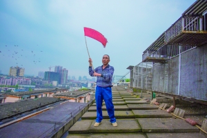 刘康健在天台上用红旗训练鸽子,对于他来说,晚年的生活乐趣就是每日看着鸽子飞翔在空中。