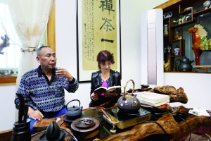 木雕茶桌前,水壶里的茶水口兹口兹作响,丝丝烟云沿着檀香坛里燃烧着的檀香飘散开来,两本闲书,一对茶杯。午后时分,刚午休醒来的刘康健静坐于茶桌前等待着茶水烧开,一旁的老伴谭雪英随意翻看着手中的书本。茶水烧好后,刘康健娴熟地洗茶、泡茶、倒茶,然后两人再慢悠悠地品上一口,身心瞬间就舒畅起来了。这一刻,夫妻俩并无过多的交流,但时光却在他们身上显得格外静谧、温馨。