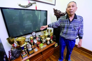 在刘康健家里的电视机柜台上,大大小小的奖杯堆满了一整个柜台,金灿灿的奖杯甚是晃眼。