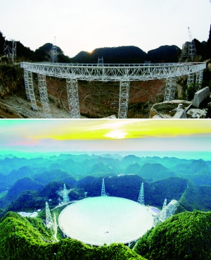 2016年7月3日,直径500米、迄今全球最大的“锅盖”在贵州喀斯特天坑中架设完成。它就是500米口径球面射电望远镜,世界上最大和最具威力的单口径射电望远镜。它被称为“天眼”,用来倾听宇宙深处声音、观测宇宙奥秘。
