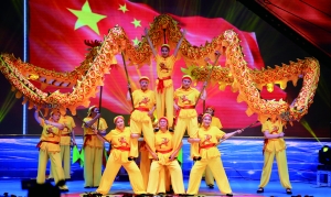 伴随着激昂地锣鼓,由巾帼英雄唐群英的家乡——白果镇选送的龙狮表演《中国龙》拉开汇演序幕。值得一提的是,这条“中国龙”是由女子舞起来的,力量与速度却一点也不逊男子。只见这条金龙在她们手里腾挪自如,活力四射,气势磅礴,将“白果巾帼不让须眉”演绎得淋漓尽致,赢得了观众如潮掌声。