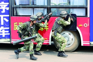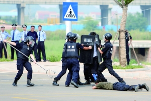 在火车站,一群“暴恐分子”正持刀“砍杀”无辜群众,两名“暴恐分子”劫持一辆面包车冲向人群。接到110指挥中心的指令,特巡警支队路面巡逻民警火速赶赴现场,同时呼叫支援。民警与及时赶至增援的武装特警将“暴恐分子”与周围群众实施分开隔离,进行现场警戒。穷凶极恶的“暴恐分子”向特警队员疯狂“砍杀”,面对危险,特警队员毫不畏惧,运用平时练就的一招制敌的真功夫,采取包抄合围之势果断出击,当场击毙负隅顽抗的“暴恐分子”1人、活捉1人,随即处置小组封控现场。
