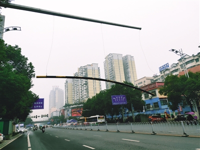 本报讯 近日,有热心读者多次致电本报新闻热线8611110反映,2日凌晨,船山大桥上发生一起交通事故,限高架受“重创”倒地,殃及前方的警示杆,妨碍车辆出行,有损市容市貌。