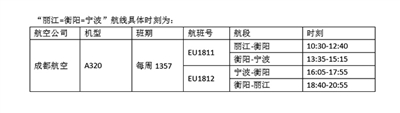 据悉,“丽江—衡阳—宁波”航线由成都航空有限公司执飞,以空客A320为主力机型,班期为每周周一、周三、周五、周日。南岳机场飞往宁波栎社国际机场的时间为13:35,抵达时间为15:15,历时1小时40分(目前,衡阳每天仅有一趟高铁直达宁波,用时8小时45分,航线开通后旅程可缩短7小时5分)。南岳机场飞往丽江三义国际机场的时间为18:40,抵达时间为20:55,历时2小时15分(目前,衡阳没有直达丽江的高铁和普铁,如从衡阳乘飞机前往昆明,再转火车前往丽江,最快用时4小时58分,航线开通后旅程可缩短2小时43分)。“丽江—衡阳—宁波”航线的开通为促进三地旅游发展、经贸往来将提供更便捷的通道。