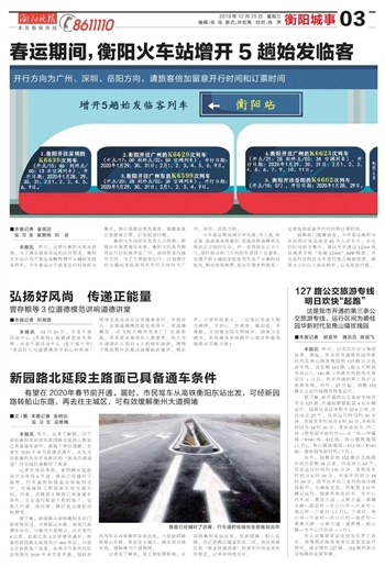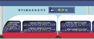 本报讯 昨日,记者从衡阳火车站获悉,为了满足旅客春运的出行需求,衡阳火车站计划于春运高峰期增开5趟始发临客列车。今年春运由于旅客出行时间较为集中,预计票源会更加紧张,提醒旅客注意提前订票,以免延误行程。