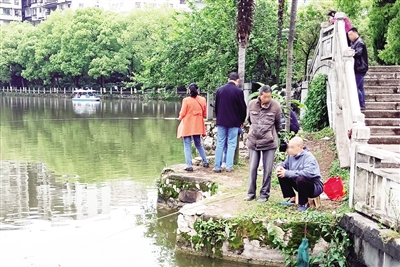 本报讯 连日来,热心市民致电本报新闻热线8611110反映,有市民抱团在岳屏公园云水湖堤岸边垂钓,破坏湖水生态环境。