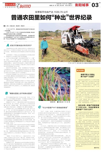 双季稻周年亩产世界纪录在衡南刷新,且突破业界公认极其重要的“1500”关卡,其意义正如袁隆平院士所言,“可以让中国增产半个湖南省的粮食”。