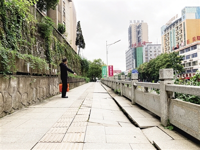当日上午,记者根据市民提供的线索来到解放大道,在名仕华府对面的步道平台看到了一条非常明显的东西向的裂缝,最宽处可以放入两根手指,砖在结合处向上翘起,还有一部分地砖随着裂缝出现了断裂。这条步道位于一处护坡附近,紧靠解放大道,一些地方已经有了明显的下沉现象。