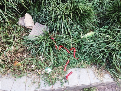 9月11日下午,在衡祁路29号地段附近,记者看见人行通道上的三处花坛内,腐烂的葡萄、辣椒、白菜及竹筷、烟蒂、地板砖等各种垃圾随处可见,草丛中甚至还有被扔弃的毛衣、扫帚等物品,散发出难闻的气味。“一些人经常将吃剩的早餐粉汤倾倒在花坛内,造成大片花草烂根枯萎。”负责道路清扫的环卫工张大伯告诉记者,这里的游摊菜贩还将卖剩的葡萄、柑橘及白菜等蔬菜水果扔弃至花坛内,地板砖则是菜贩占地盘所用的道具。