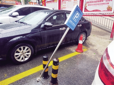 在岳屏公园南门口,施划了两处无障碍专用停车位,其中一处竖立了醒目的指示牌。10月31日下午,记者现场发现,无障碍专用停车位指示牌被撞歪倒,一辆黑色的别克车占据了停车位,一辆防水补漏的面包车则占用了另一处停车位。