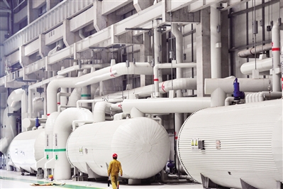 11月3日,在国家能源集团湖南永州电厂,工作人员经过1号机组的高压加热器。