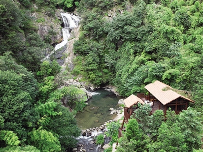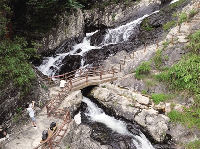 从峡谷上游东江村拾级而下,清风徐来,凉爽透顶。沿着茂密的竹林徒步前行,两岸山高林密,杉木与南竹郁郁葱葱,溪流曲折险要,溪水清澈湍急,潺潺的流水声与悦耳的鸟啼声回荡谷中。