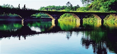 桃园四面被蜿蜒曲折的长冲湖包围,湖上荷叶田田,湖中一座修建于20世纪50年代的石拱桥在落日余晖下更显神秘。这时节,在桃园除了体验黄桃采摘的乐趣,还能在午后约上好友一起垂钓,晚上可以留宿桃园山庄。青砖瓦黛,桃园山庄的徽派建筑风格荡漾五彩,简约的黑白色调呈现出独有的诗意。
