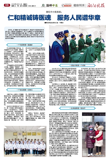 近年来,在“健康中国”的战略指引下,衡阳市中医医院坚持党建引领,不断提升党建影响力,将“仁和精诚”作为医院的精神坐标,贯穿于党建品牌创建全过程,融入“仁者爱人、和谐为贵、精于医术、诚信为本”的院训精神,促进党建与业务“同频共振”,开创了党建与业务双融双促的发展新格局,奏响了新时代中医药传承创新的华彩篇章。