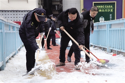 青山街道干部职工合力清除人行过街天桥上的冰雪。 ■胡亚华 摄
