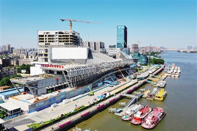广东美术馆、广东非物质文化遗产展示中心、广东文学馆“三馆合一”建筑长350米,高近80米,宛如一艘“文化巨轮”扬帆珠江(10月12日摄,无人机照片)。 日前,中建三局承建的广东美术馆、广东非物质文化遗产展示中心、广东文学馆“三馆合一”项目进入幕墙施工及装饰装修施工阶段。该项目位于广州珠江白鹅潭,其外形宛如一艘“文化巨轮”扬起风帆。 作为广东省重点文化工程,该项目建成后可辐射粤港澳大湾区,成为彰显广东特色、具有国际水平的标志性公共文化设施。■新华社发